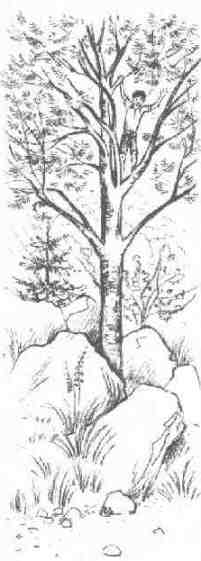 Agile comme il l'est à onze ans, notre garçon se voit déjà sur un arbre... Vingt minutes plus tard il n'a plus qu'à attendre sur son perchoir! Ses parents et son frère Etienne seront bien malins s'ils réussissent à le découvrir, surtout qu'il a bien choisi son arbre: un frêne dont le tronc s'élance entre des blocs de rocher qui tous pourraient être autant de bonnes cachettes. Etienne va sûrement regarder là-derrière, mais jamais il ne pensera à lever les yeux! Les cris joyeux du petit Daniel annoncent à notre grimpeur que la troupe arrive. Le cœur de Jeannot bat à se rompre. De son poste d'observation, à quatre mètres du sol, il les voit si bien maintenant, qu'il craint presque d'être repéré tout de suite. Etienne appelle Jeannot, mais personne ne répond. Avec son papa, il cherche, comme prévu, parmi les rochers. Daniel et la maman inspectent les buissons en bordure du chemin. Personne! Pas de Jeannot. On va fouiller plus loin... Mais la branche est sèche! Un sinistre craquement, et le garçon bascule! Vainement il essaie de se raccrocher plus bas. La tête la première il arrive au sol, disparaissant derrière un rocher, puis... silence! Les parents se précipitent, anxieux. Jeannot est là, évanoui. Son visage, encore plus blanc que celui des parents, n'a pas une trace de sang. Les minutes passent mais on dirait des heures. |
