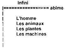 Quelles relations existe-t-il entre la création et Dieu, et qu'y a-t-il à l'intérieur même de la création? Si l'on envisage le caractère infini de Dieu, il y a rupture entre lui et l'ensemble de sa création. En tant que créature finie, je suis aussi séparé du Dieu Créateur et infini que l'atome ou qu'une particule d'énergie. A cet égard, je ne suis pas plus proche de lui qu'une machine.