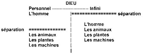 Mais au regard de la personnalité de Dieu, la séparation se situe entre l'homme et le reste de la création. Autrement dit, en utilisant le vocabulaire en vogue, il y a là une conception dynamique que l'homme et la théologie modernes ignorent. C'est ainsi que Schweitzer s'identifiait à l'hippopotame, car il ne comprenait pas que l'homme se définit par rapport à ce qui est plus haut que lui; aussi portait-il ses regards en bas vers une créature dont le comportement ressemble souvent au sien. Alors que pour ce qui concerne notre personnalité, le fait de se référer à ce qui est plus haut que nous met en évidence ce qui est spécifique à notre nature humaine.