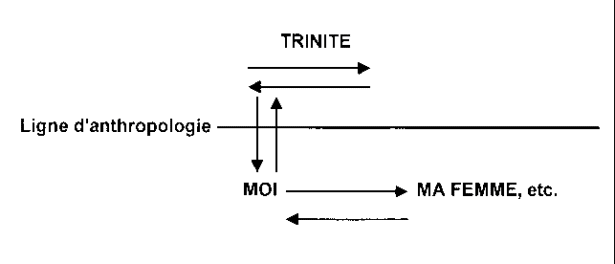 Au- dessus de la ligne d'anthropologie, horizontalement, Dieu le Père a aimé Dieu le Fils avant la création du monde. Verticalement, Dieu m'aime, également, moi qui suis sous cette ligne. Le mot "amour" et l'acte d'aimer sont passés sous la ligne d'anthropologie. Verticalement, je dois aussi aimer Dieu, et le mot "amour" et l'acte d'aimer sont passés au-dessus de la ligne d'anthropologie. Enfin, Dieu m'ordonne d'aimer ma femme, mes enfants, mes proches et le mot "amour" et l'acte d'aimer sont, horizontalement, sous cette ligne.