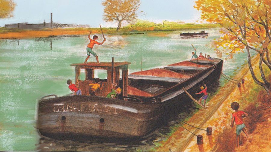 Sa coque foncée se détache très bien sur l'eau étincelante. Une vieille péniche! Elle est oubliée là, retenue à la vie par des câbles rouillés. Nos jeunes aventuriers l'ont repérée l'autre jour. Quelle aubaine! Ils ont apporté une planche qui leur a servi de passerelle. Et hop! Ils ont grimpé sur le "navire".